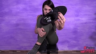 Gorgeous Petra looks hotter than the Tropic as she flaunts her slim, toned legs in a sporty outfit consisting of a hunter green top, a pair of second-skin leggings that cling to her curves and sculpted thighs, striped socks and black training shoes. The sensual brunette has just finished her workout at the gym. She takes off her smelly shoes and socks, and seductively teases you with her sweaty, sticky feet.