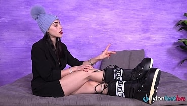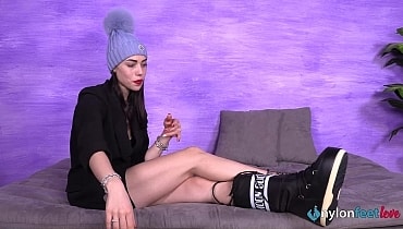 This web site contains sexually explicit material:Gorgeous brunette Petra is so sexy it hurts, and looks hotter than a summer heatwave even when it's freezing cold outside. She exudes sexiness in a black jacket paired with a grey beanie with pom-poms on the end and a pair of black Moon Boot après-ski boots. The sexy brunette flaunts her slim, toned legs, takes off her boots and exhibits her delicious feet clad in embroidered nylon socks. She then lays on her stomach, allowing you to get a good look at her fabulous soles.